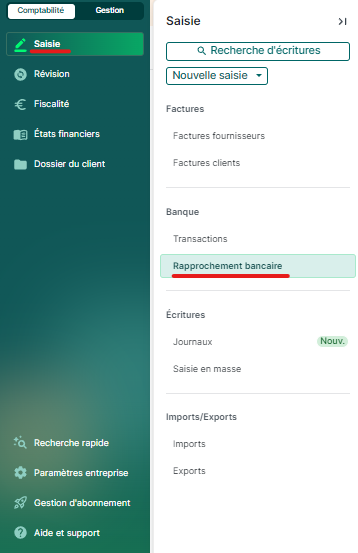 Pour pointer les banques, vous pouvez utiliser le module de Rapprochement bancaire, accessible depuis le menu Saisie > Rapprochement bancaire :