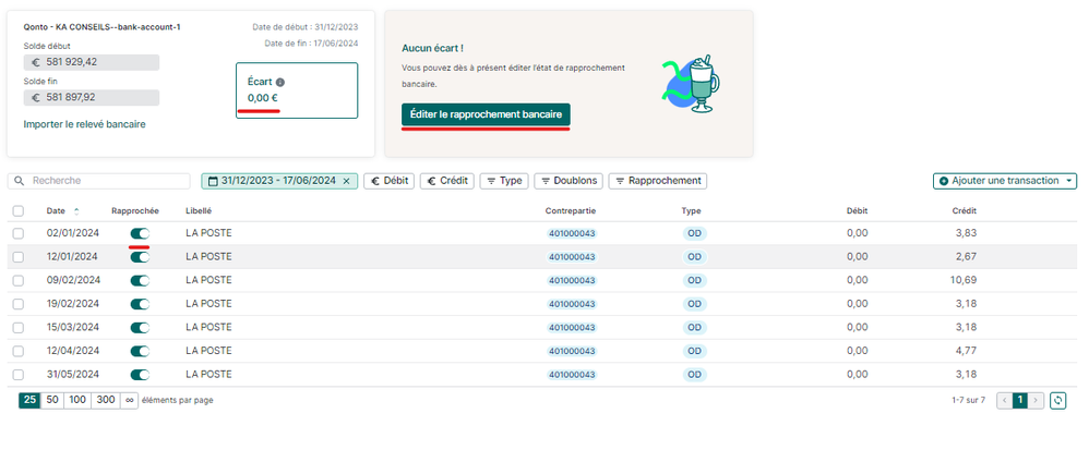Enfin, vous pourrez dé-rapprocher si besoin les transactions, visualiser l’écart, ajouter des écritures et éditer le rapprochement bancaire une fois terminé 😊