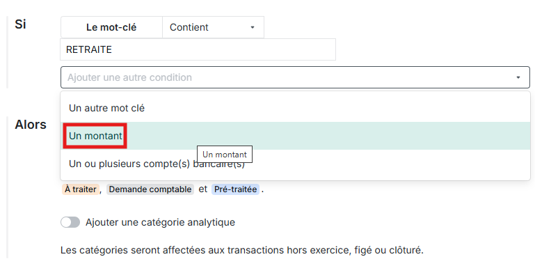 Pour cela, lorsque vous ajoutez une condition de montant, je vous invite à mettre un - s'il d'agit d'un décaissement et un montant positif s'il s'agit d'un encaissement 😊