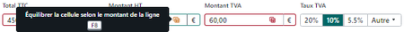 En effet, le raccourci F8, vous aide à recalculer le montant HT lorsque vous avez seulement saisi le montant de TVA et le taux de TVA sur la ligne. (Différent de F9 car F9 recalcule le champ en se basant sur le montant total de la facture, pas seulement la TVA de la ligne).