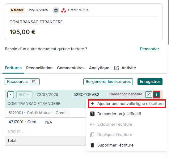 Depuis le menu Saisie > Transactions bancaires, je vous invite à cliquer sur la transaction du "virement de masse". Ensuite, je vous invite à ajouter une nouvelle ligne via les ... > Ajouter une nouvelle ligne d'écriture
