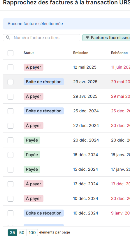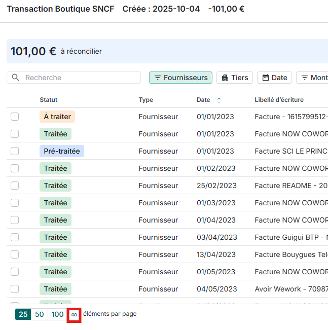 Je viens de recevoir le virement, je souhaite le rapprocher avec les factures. Depuis transaction je clque sur ajouter une factures, le module pour rapprocher les factures à la transaction s'ouvre. Je selectionne mon fournisseur, la date d'emission (mois dernier). 1500 factures au total, Mais je ne peux faire derouler et donc sélectionner seulement maximum 100 factures. Du coup je ne peux pas selectionner les 1500 factures d'un coup. J'ai donc du recommencer 15 fois la manipulation et c'est un peu long.