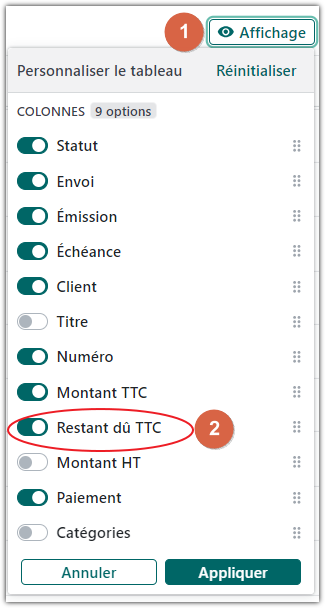 Il me semble que cette fonction est disponible à partir des options d’affichage à droite du tableau des factures.