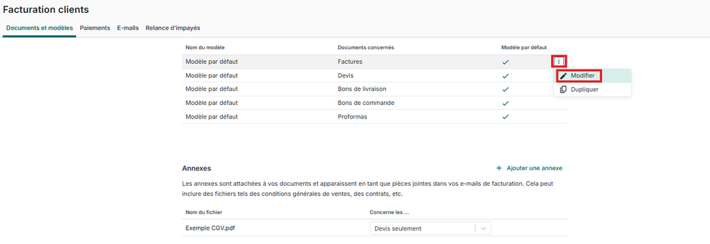Tout d'abord, vous pouvez indiquer le nom de l'agent sur chaque facture client via l'ajout d'un champ personnalisé en éditant le modèle de facture depuis le menu Paramètres entreprise > Facturation client > Documents et modèles :