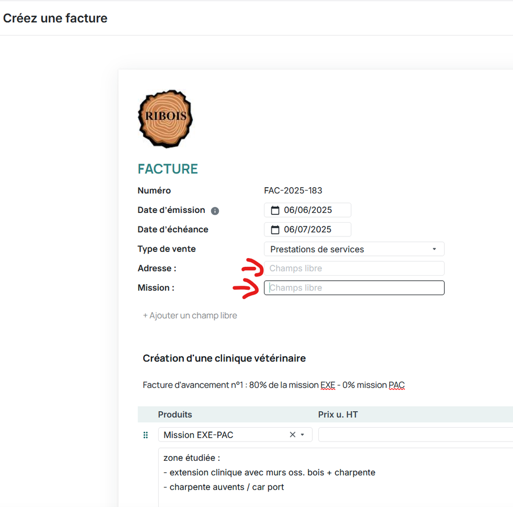 Dans le modèle de devis et facture, j'ai ajouté des "Champs d’en-tête" nommés "adresse" et "mission".
