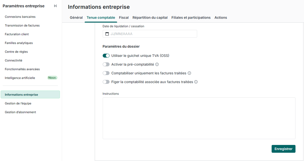 Pour avoir cette vision, je vous invite à activer le Guichet unique TVA depuis les Paramètres entreprise > Informations entreprise > Tenue comptable