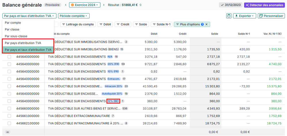 Bien que la TVA soit dans le même n° de compte comptable, un "tag" pays est ajouté à l'écriture pour que vous puissiez toujours distinguer la TVA en fonction des différents pays 😊