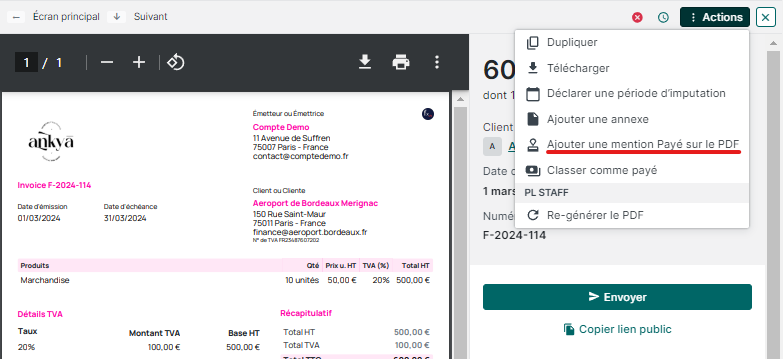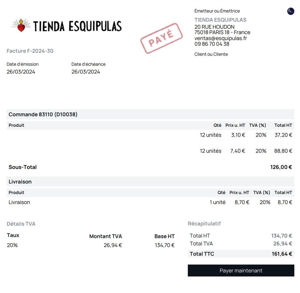 Afin que le bouton “Payer maintenant” ne figure pas sur les factures déjà payées, vous pouvez simplement Ajouter une mention Payé sur le PDF de la facture, comme-ci dessous :