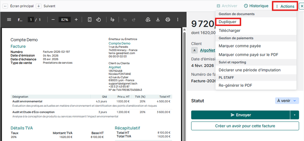 Pour dupliquer une facture, je vous invite à vous rendre sur celle-ci et à cliquer sur Action > Dupliquer 😊