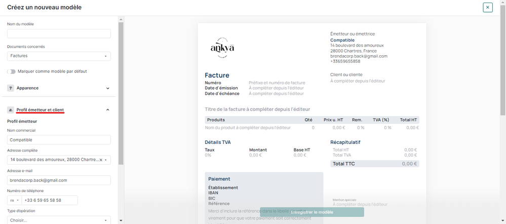 Ensuite, vous pourrez librement créer différents modèles de facture avec des profils émetteurs différents :
