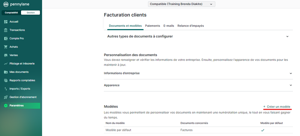 Pour cela, je vous invite à vous rendre dans Paramètres > Facturation clients > Créer un modèle :