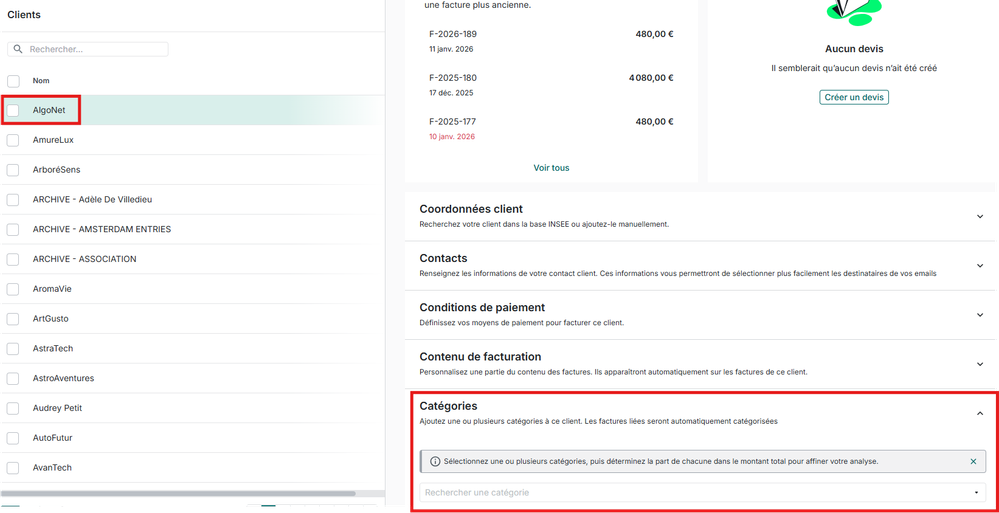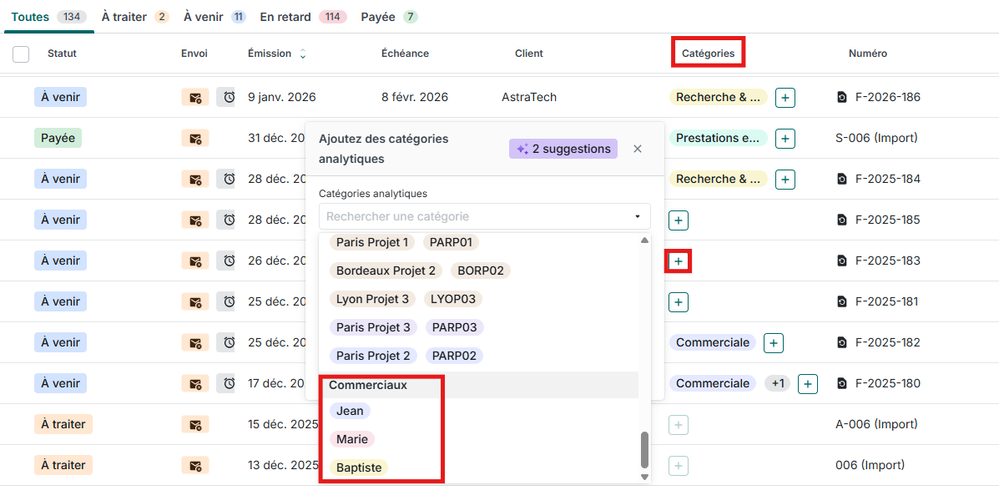 Ensuite, vous pourrez ajouter la catégorie correspondant au commercial sur chaque facture de vente :