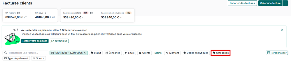 Enfin, depuis le menu Ventes > Factures clients vous pourrez utiliser le filtre Catégorie et ainsi filtrer par commercial :