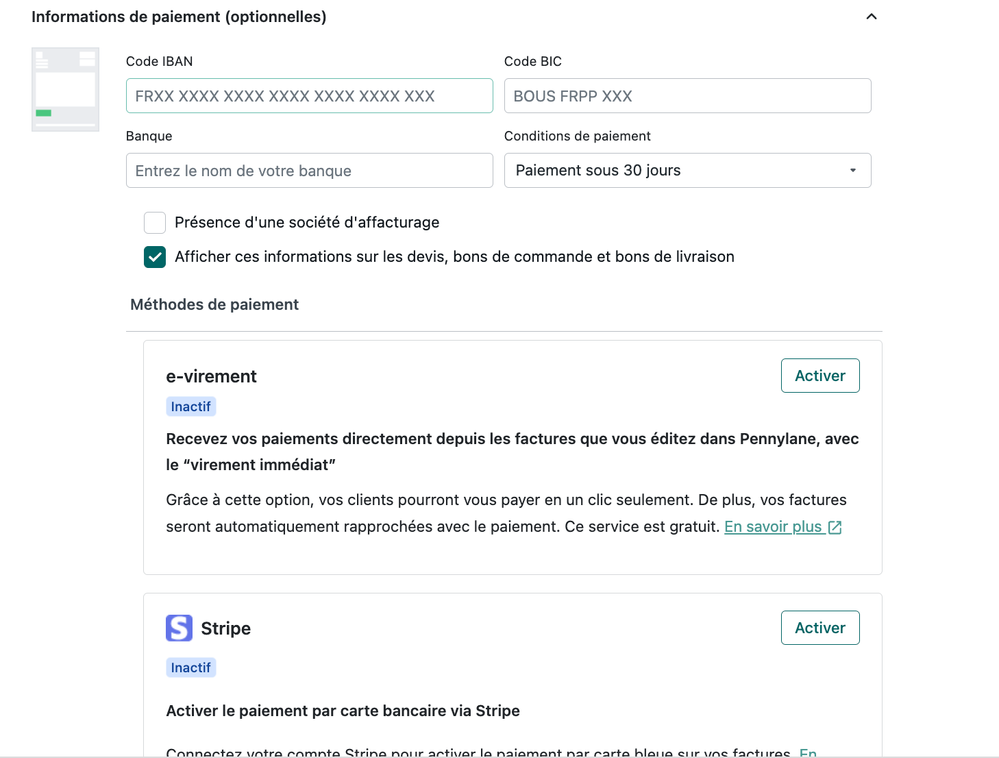 Vous pouvez d’ailleurs activer le “e-virement” pour que vos clients puissent vous régler en un seul clic.