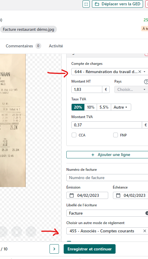 (J’ai “détournée” une facture resto, car je n’ai pas d’exemple rémunération gérant à portée de main)