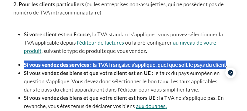 En principe, lorsqu’un assujetti implanté en France réalise une prestation pour un particulier, de la TVA française doit être facturée, qu’importe l'implantation de son client particulier (cf. Art. 259-2 du CGI). Mais il est vrai qu’il existe de nombreux cas d’exceptions 😊