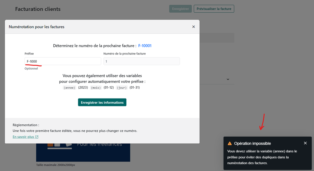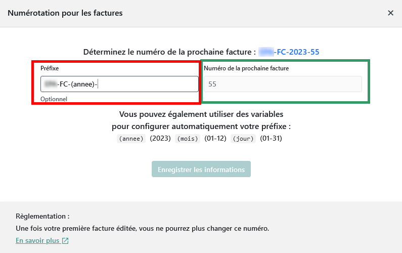 La possibilité de modifier librement le préfixe (en rouge) de la structure de nommage des factures de vente