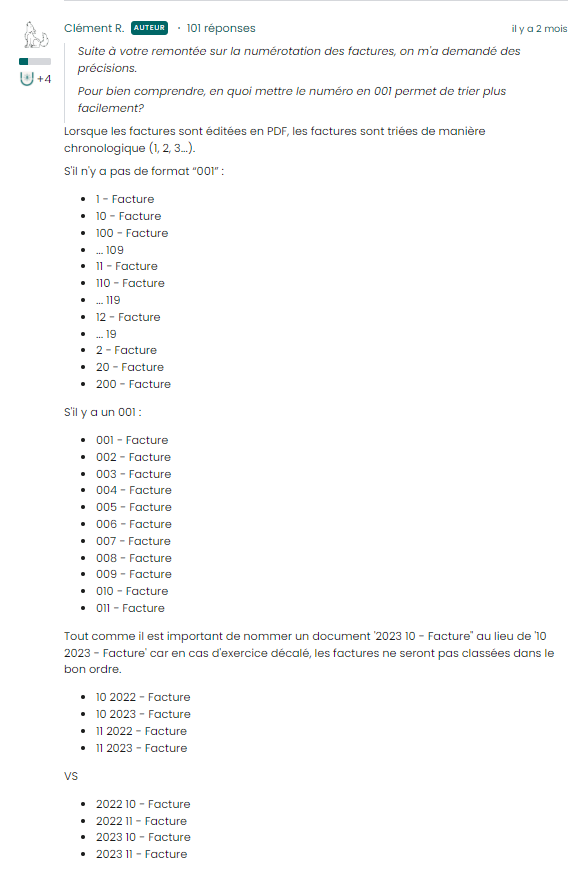 Si j’essaie d’expliquer ça en terme d’informatique basique (si j’ai bien compris le format des cellules, mais je peux me tromper bien sûr) les n° d facture sont au format “integer”. Pour pouvoir afficher un truc comme “0001” il faudrait un champ au format “texte”. - Donc mon idée était de commencer avec 10001 alors le programme va bien incrémenter le 10001 vers 10002 etc.