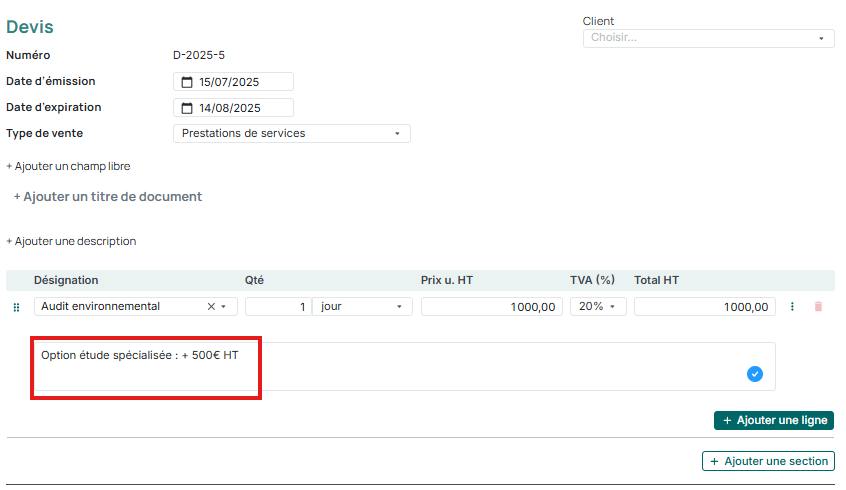 Cas d'usage : J'aimerais pouvoir proposer à mes clients des prestations optionnelles (services complémentaires, options de personnalisation, modules additionnels, etc.) qu'ils pourraient sélectionner eux-mêmes avant validation du devis, sans nécessiter d'échanges multiples par email.