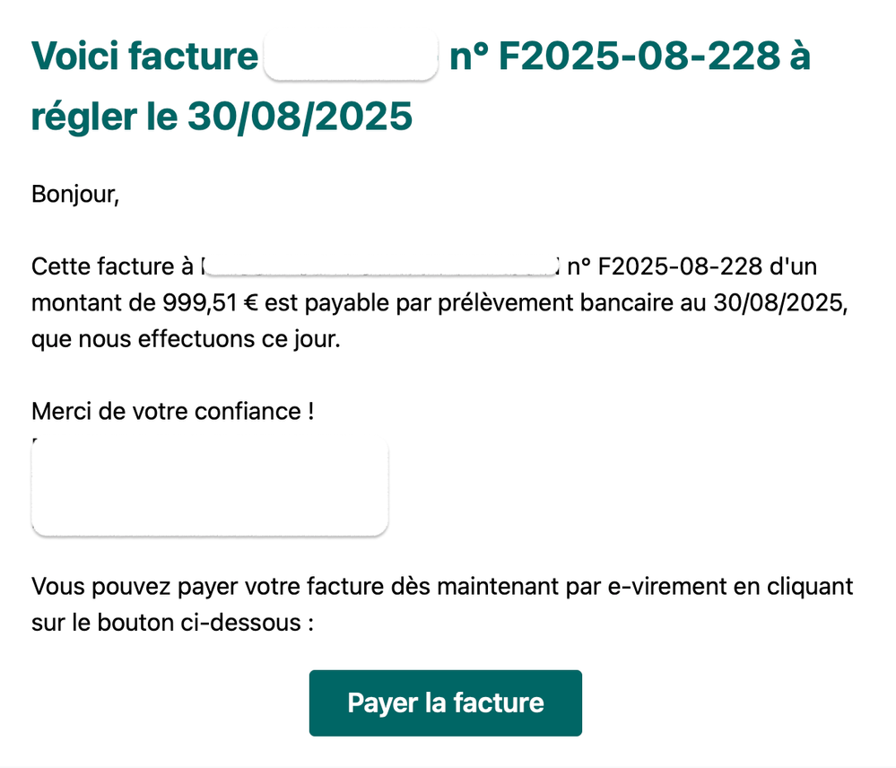 Et on se retrouve avec cette phrase " Vous pouvez payer votre facture dès maintenant par e-virement en cliquant sur le bouton ci-dessous : Payer la facture", incompréhensible pour mon client, et impossible à enlever.😡