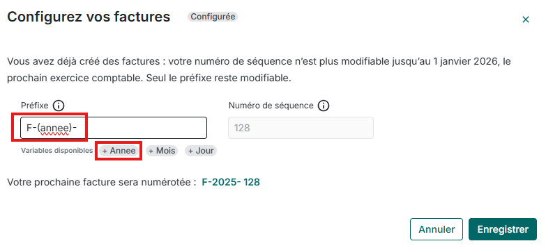 Pour moi, il faut laisser à minima F-2025- (ou une autre chaîne de caractères à la place de F) en préfixe, et en numéro de séquence le prochain numéro de facture.