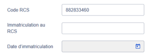 Bonjour, Je souhaite ajouter le RCS Meaux à mes Factures mais je ne peut apparemment pas éditer cette information. Dans code RCS il n’accepte que le Code et Immatriculation au RCS n’est pas éditabl...