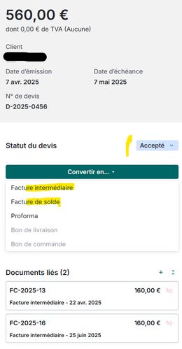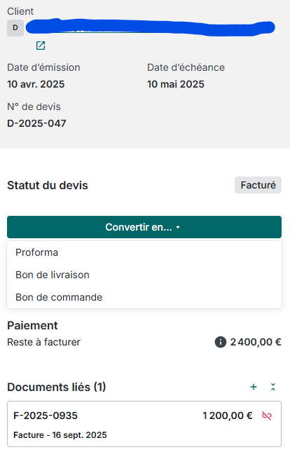 Il y a du reste à facturer mais le devis apparaît comme facture et impossible de faire de nouvelles factures intermédiaires ou une de solde.
