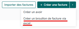 Enfin, depuis le menu Ventes > Factures clients je vous invite à cliquer sur la flèche à côté de Créer une facture, puis cliquer sur Créer un brouillon de facture via Excel