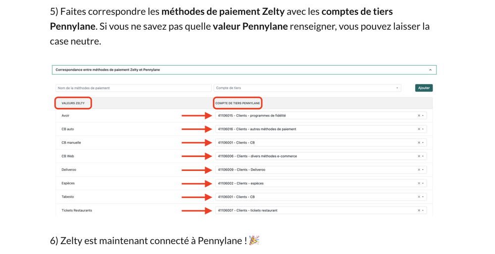 Tout d’abord, lors de la connexion avec Zelty, vous pouvez mapper les méthodes de paiement avec le compte souhaité.