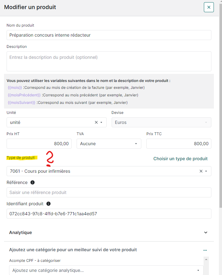 je propose de renommer l’intitulé du champs “Type de produit” en “compte comptable” quand on clique d’abord sur “Choisir ...” , car c’est en effet un compte qu’on peut choisir dans son plan comptable.