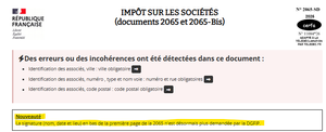 Bonjour, Lors de l'établissement de la 2065 de la liasse fiscale cette remarque apparait : Or un tour sur le BOI du 06/04/16 encore en vigueur aujourd'hui (BOI-IS-DECLA-10-10-10 § 170) nous indique bien que la déclaration doit être obligatoirement signée. Est-ce que quelqu'un se serait renseigné auprès de la DGFIP à ce propos ? MerciRépondu96Vues0like1CommentaireSCI - Liasses - Infos permanentes et 2072-SD