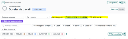 Bonjour, Je souhaiterai éditer une balance PDF au 30.06.2025 avec un comparatif au 31.12.2024. Par défaut le comparatif est au 30.06.2024. Cela n'est pas possible actuellement. Pourriez vous intégrer la possibilité de choisir la période de comparaison n-1 lors de vos prochaines améliorations ? Merci.76Vues3likes1Commentaire